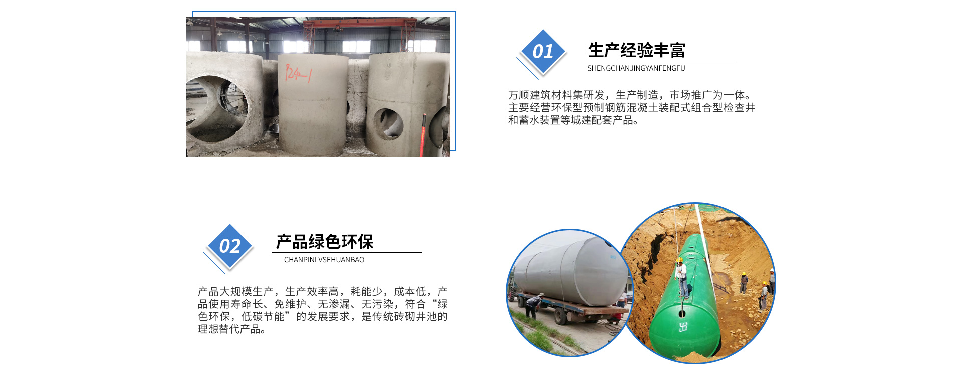 黃山市萬順建筑科技有限公司是集研發(fā),生產(chǎn)制造,市場推廣為一體的綜合性企業(yè)。公司主要經(jīng)營環(huán)保型預(yù)制鋼筋混凝土裝配式組合型檢查井和蓄水裝置等城建配套產(chǎn)品。產(chǎn)品生產(chǎn)過程采用獨特的生產(chǎn)工藝,機械化流水作業(yè)。產(chǎn)品大規(guī)模生產(chǎn),生產(chǎn)效率高,耗能少,成本低,產(chǎn)品使用壽命長、免維護、無滲漏、無污染,符合“綠色環(huán)保,低碳節(jié)能”的發(fā)展要求,是傳統(tǒng)磚砌井池的理想替代產(chǎn)品。